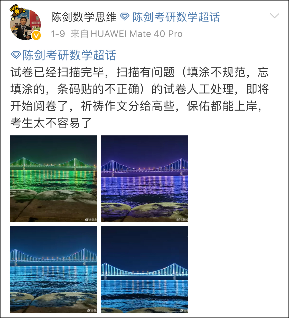 根据各省的通知来看,甘肃省是最早开始阅卷工作的,12月28日起;黑龙江地区将于元旦后开启。陈剑老师近日也在微博表示:试卷已经扫描完毕,扫描有问题的试卷人工处理,部分地区阅卷工作近期即将启动。