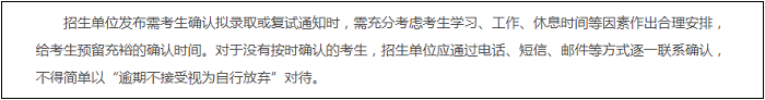 对于没有按时确认的考生,招生单位应通过电话、短信、邮件等方式逐一联系确认,不得简单以“逾期不接受视为自行放弃”对待。”