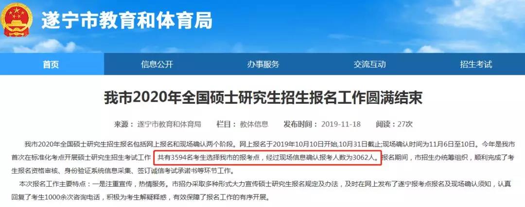 今年是遂宁市首次在标准化考点开展硕士研究生招生考试工作,共有3594名考生选择遂宁市的报考点,经过现场信息确认报考人数为3062人。