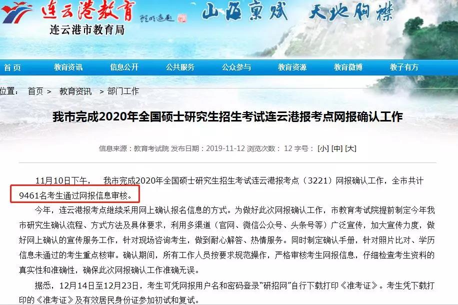11月10日下午,连云港市完成2020年全国硕士研究生招生考试连云港报考点(3221)网报确认工作,全市共计9461名考生通过网报信息审核。