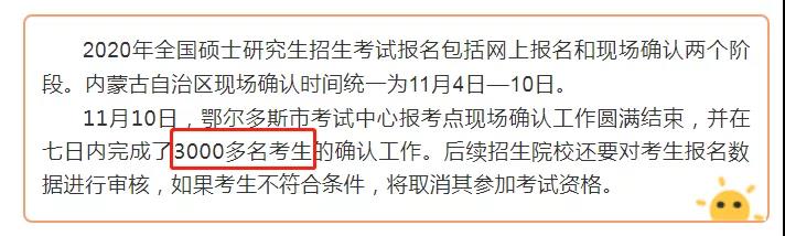 2020年硕士研究生考试现场确认工作于2019年11月9日顺利结束,最终确认人数达8316人,较去年增加1370人。