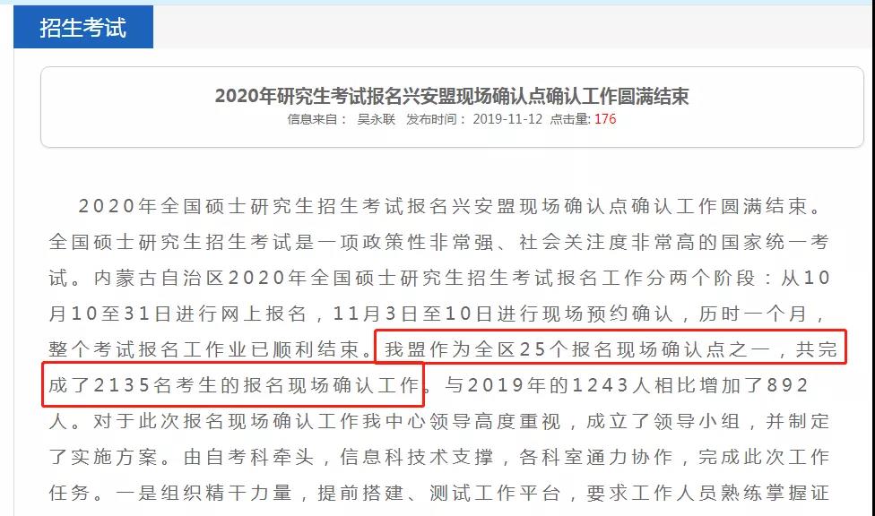 兴安盟作为全区25个报名现场确认点之一,共完成了2135名考生的报名现场确认工作。与2019年的1243人相比增加了892人。