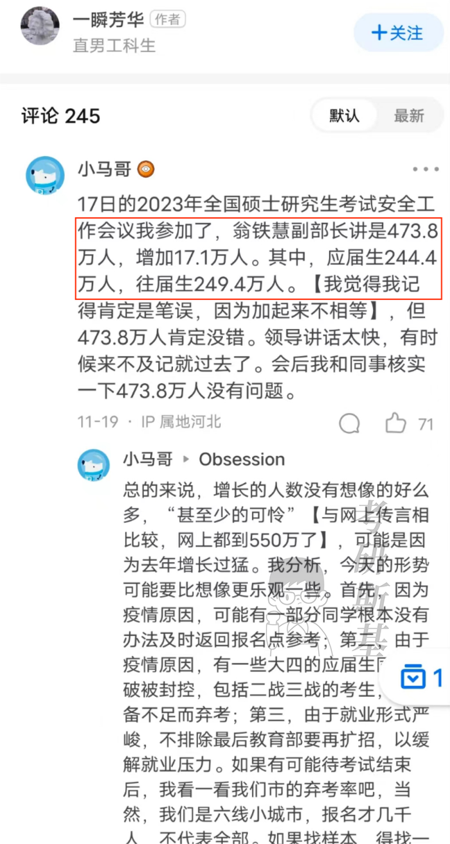 那23考研报考人数究竟是多少呢?据一位参加了2023年全国硕士研究生考试安全会议的网友透露,23考研实际报考人数可能为473.8万人,距2022年报考人数仅增长17.1万人。这位博主去年就预估出了22考研的报考人数,和实际报考人数相差并不大,所以还是有一定可信度的。但是具体的考研人数大家还是以官方通知为准。