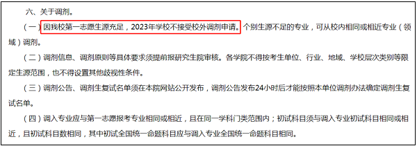 我校第一志愿生源充足,2023年学校不接受校外调剂申请。个别生源不足的专业,可从校内相同或相近专业(领域)调剂。