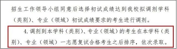 调剂到本学科(类别)、专业(领域)的考生在本学科(类别)、专业(领域)一志愿复试合格考生之后排序,依次录取。