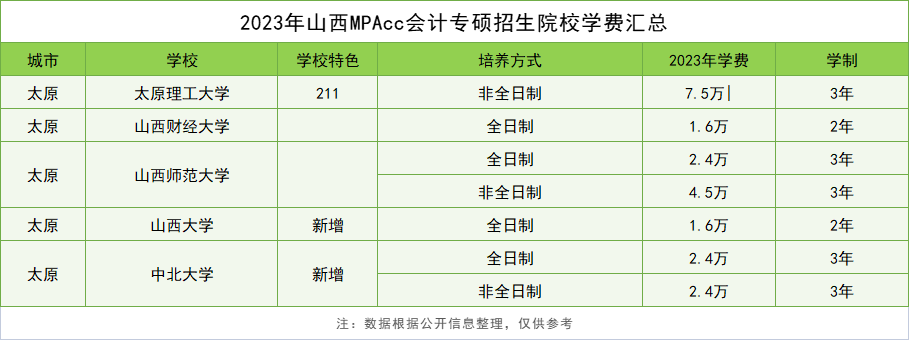 山西省目前有5所院校开设MPAcc会计专硕招生。