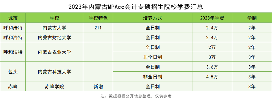 内蒙古目前有5所院校开设MPAcc会计专硕招生。