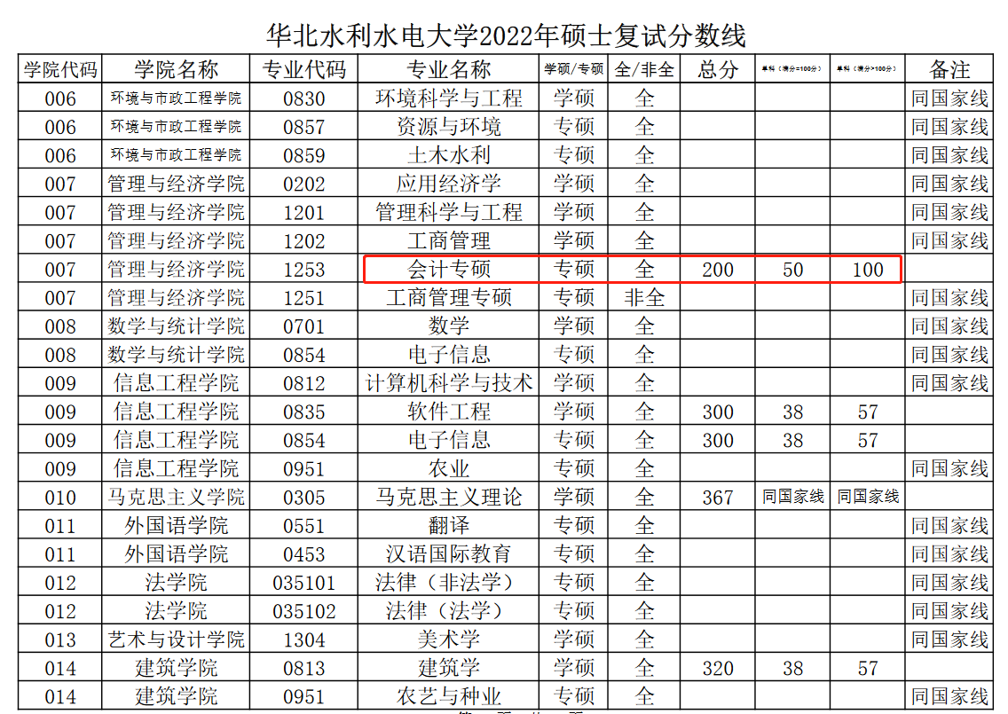 华北水利水电大学2022年MPAcc复试分数线:200/50/100