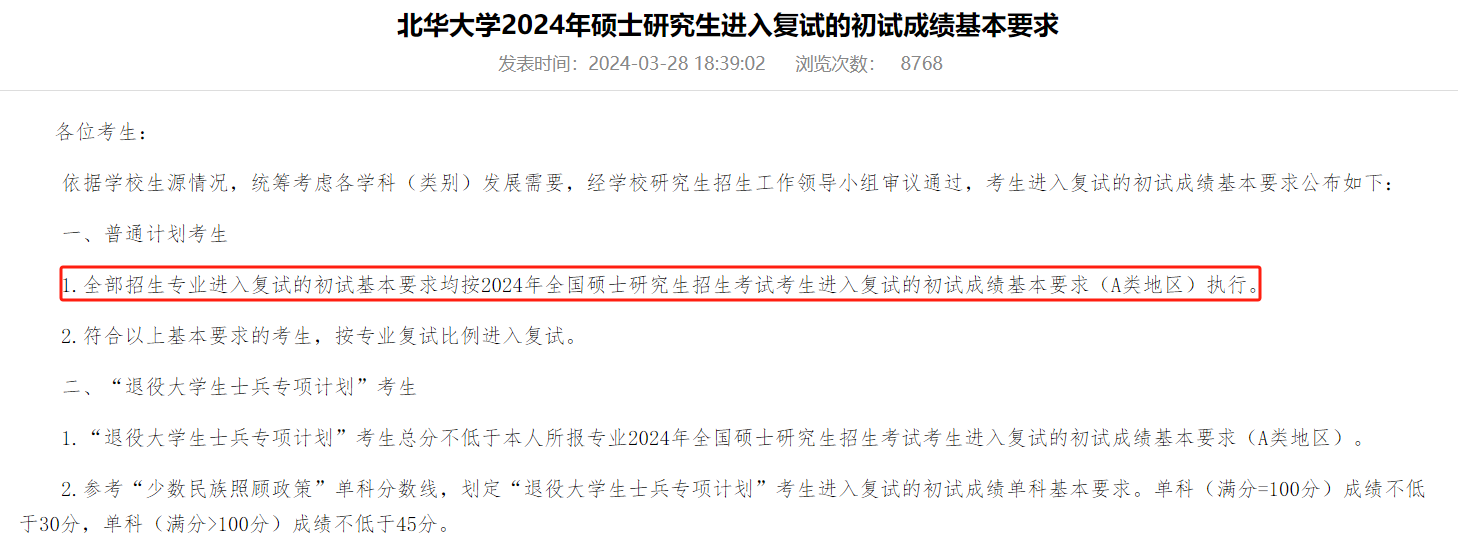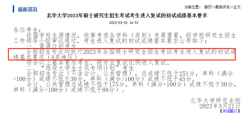 北华大学2023年硕士研究生招生考试考生进入复试的初试成绩基本要求已公布,2023年MPAcc复试分数线:197/51/102。