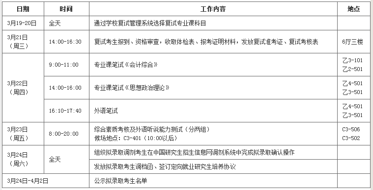 专业能力考核方式为笔试,考试科目为《会计综合》和《思想政治理论》。主要测试考生专业素质和专业能力,全面考核考生对财务会计学、财务管理、审计学等相关课程的基本知识、基本理论的掌握程度,利用所学理论发现、分析和解决问题的能力。考试大纲详见《2018年商学院硕士研究生招生考试复试大纲》。