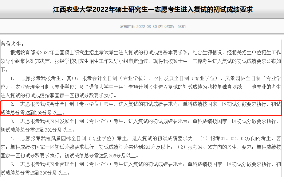 一志愿报考我校会计专业学位硕士考生进入复试的初试成绩要求为:单科成绩按国家一区初试分数要求执行,总分需达到188分及以上(具体名单见附件1)。