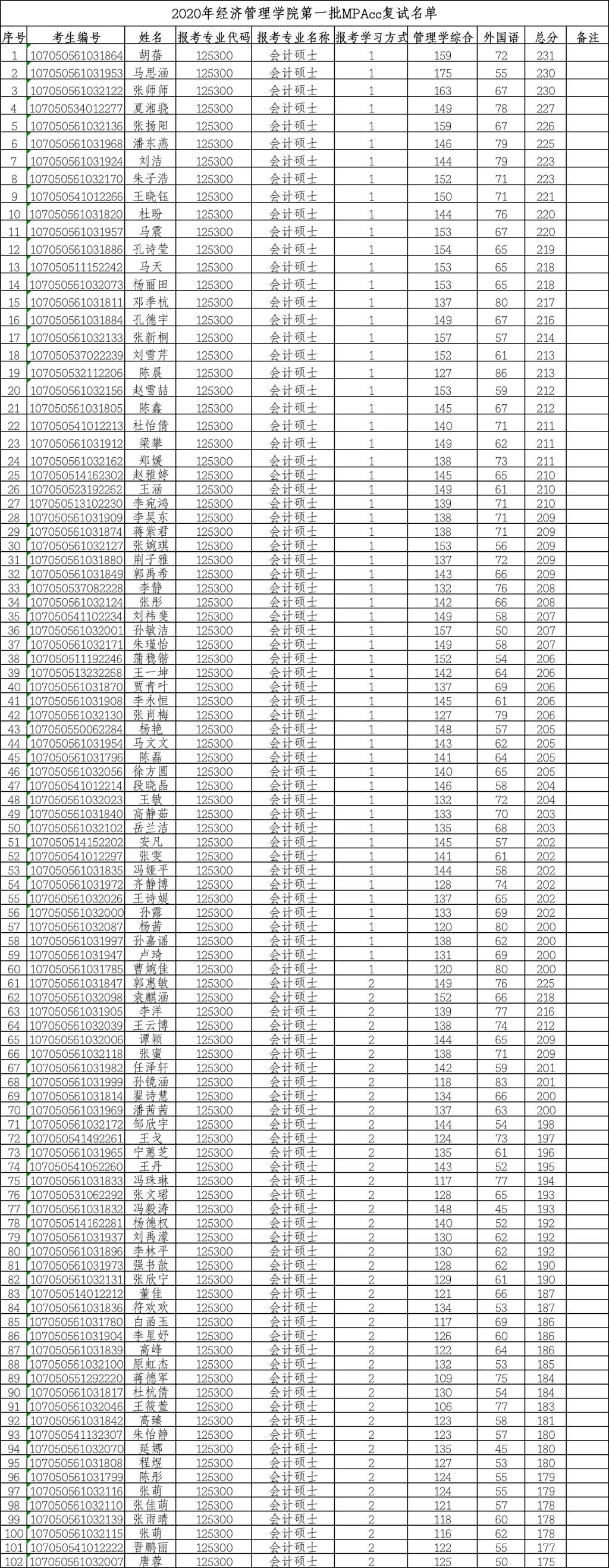 天津大学2019年MPAcc复试分数线