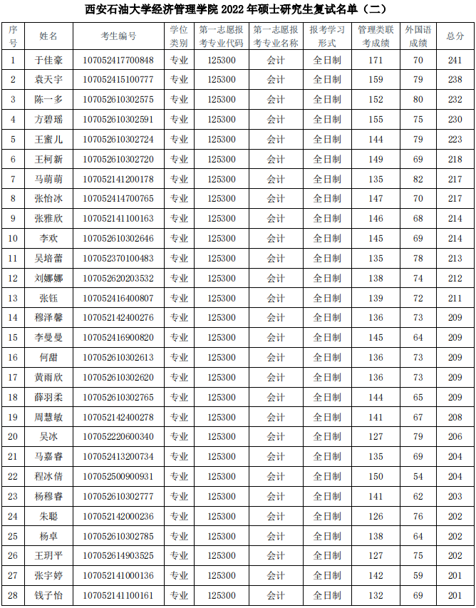 西安石油大学2022年MPAcc复试分数线