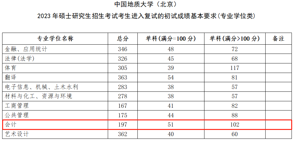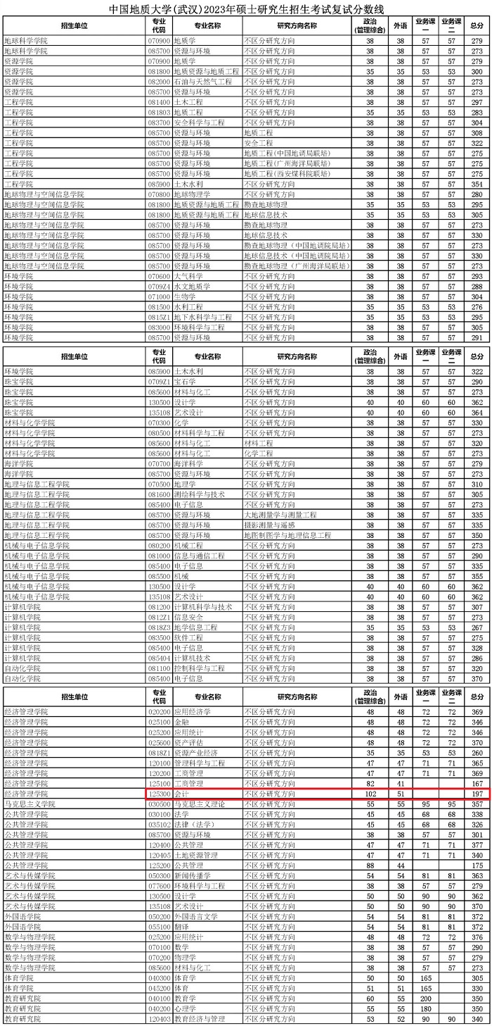 中国地质大学(北京)2023年MPAcc复试分数线:197/51/102