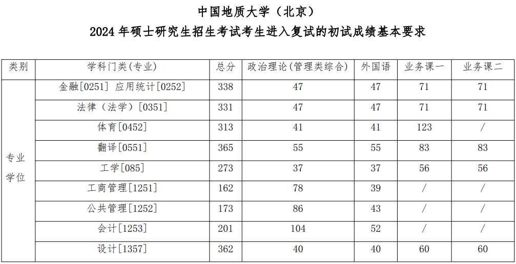 中国地质大学(北京)2024年硕士研究生招生考试考生进入复试的初试成绩基本要求已公布,2024年MPAcc复试分数线:201/52/104。