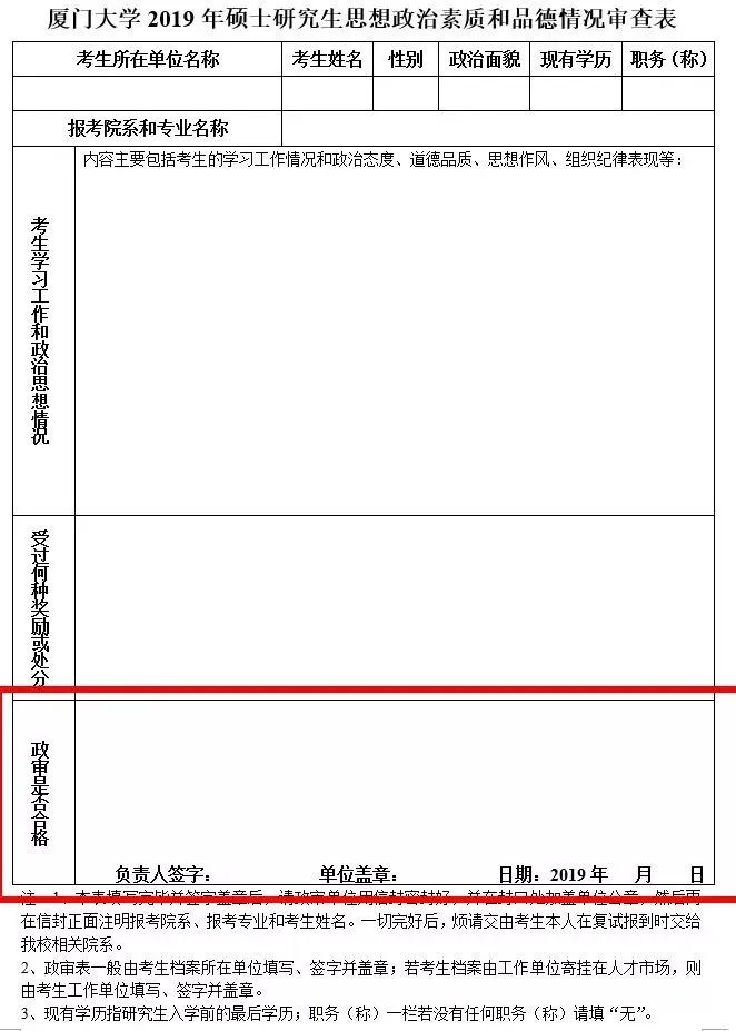 政治审核表:档案单位一般应与报名时填报的学习单位一致,由考生所在院系填写并盖章,该表需要在院校网站下载。