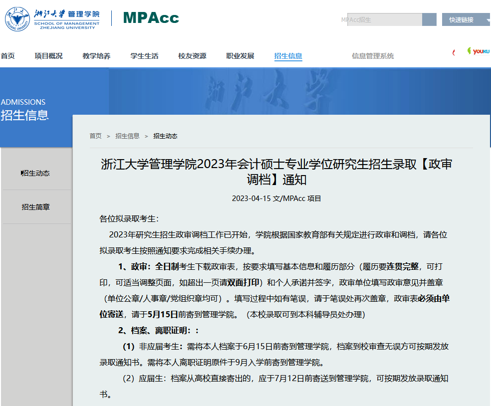 :需将本人档案于6月15日前寄到管理学院,档案到校审查无误方可按期发放录取通知书。需将本人离职证明原件于9月入学前寄到管理学院。