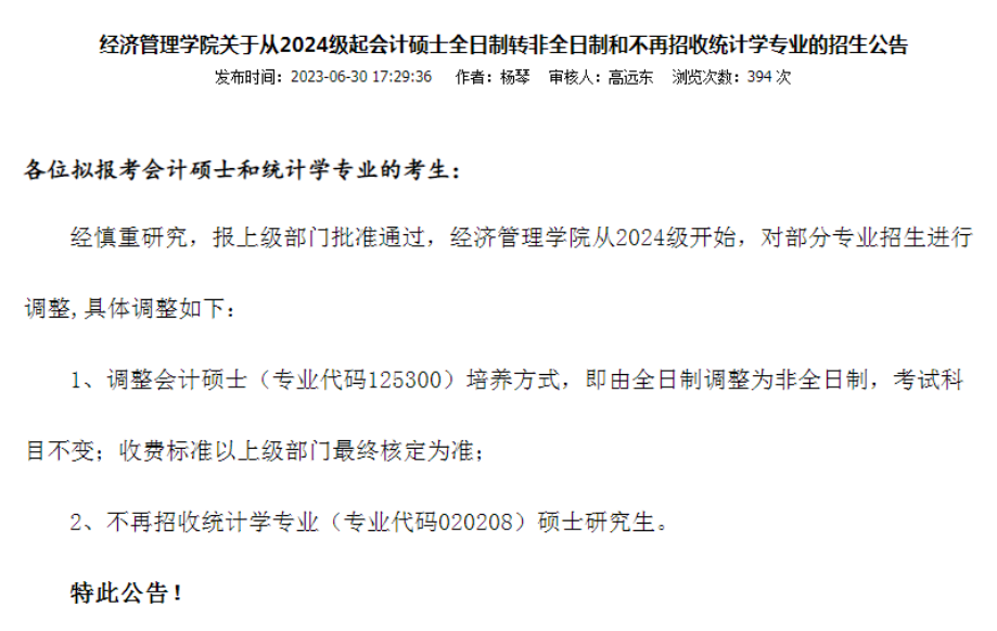 近日西南大学经济管理学院公布从2024级起会计硕士全日制转非全日制和不再招收统计学专业的招生公告。