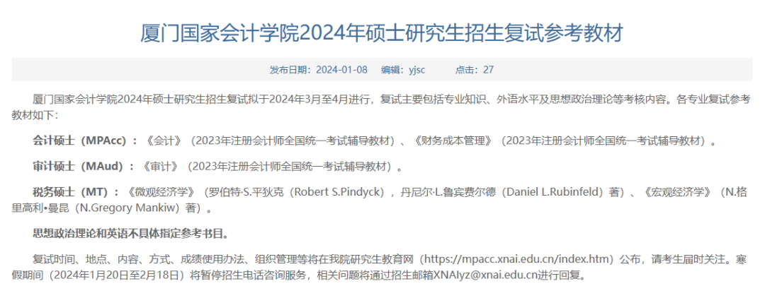 大家复试开始准备了吗?最近厦门国家会计学院公布2024年硕士研究生招生复试参考教材,同时学校提到2024年硕士研究生招生复试拟于2024年3月至4月进行,复试主要包括专业知识、外语水平及思想政治理论等考核内容,有报考这所院校的同学注意一下哦!