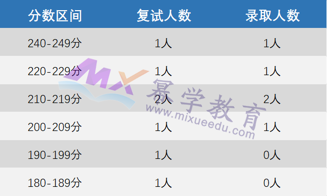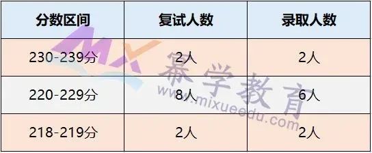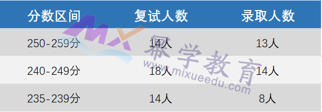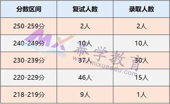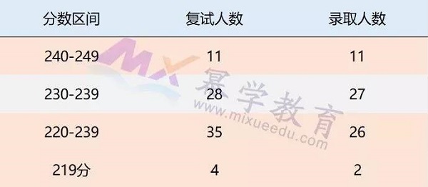 全日制:进入复试95人,最高分250分,最低分225分;拟录取71人,最高分250分,最低分225分。