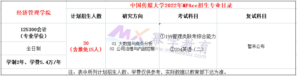 中国传媒大学2022年全日制MPAcc计划招生30人,含推免15人,学制2年,学费5.4万/年。