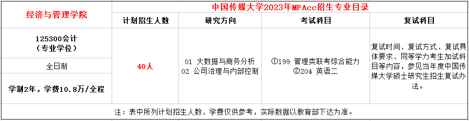 中国传媒大学2023年攻读硕士学位研究生招生简章!2023年MPAcc拟招生40人,学费全程108000元,学制2年!