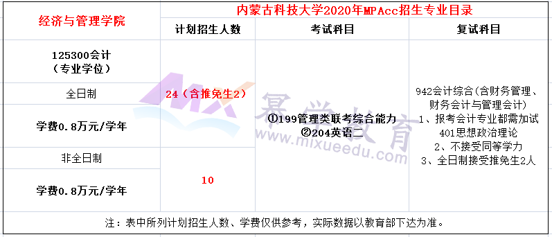 内蒙古科技大学2019年MPAcc全日制招收10人,非全日制招收10人,学费每学年8000元。
