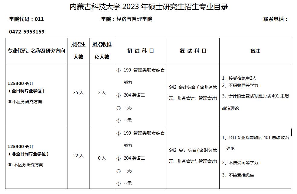 内蒙古科技大学2023年全日制MPAcc计划招生35人,推免2人,学制3年,学费1 2万 年;非全日制22人,学制3年,学费1 5万 年。