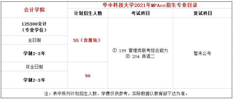 华中科技大学2021年MPAcc项目全日制计划招生55人,非全日制计划招生90人,学制2-3年。