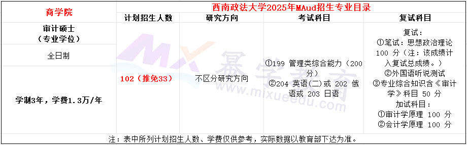 西南政法大学2021计划招生全日制审计硕士125人,拟推免15人,学制3年,学费1.3万/年。