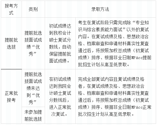 3、我院会计硕士非全日制实行“提前批选拔”和“正常批报考”招生。“提前批选拔”面试成绩“优秀”者,参加全国联考初试成绩达到我校会计硕士提前批分数线的考生,只需完成除“专业知识与综合素质能力面试”以外的复试内容,在复试成绩及格、思想政治合格、档案审查和申请材料真实性复查通过后,将按照加权总成绩(初复试成绩)排序、根据招生计划从高至低录取。“提前批选拔”面试成绩仅招生当年有效。“提前批选拔”面试成绩未达到“优秀”者则按正常报考流程报考。
