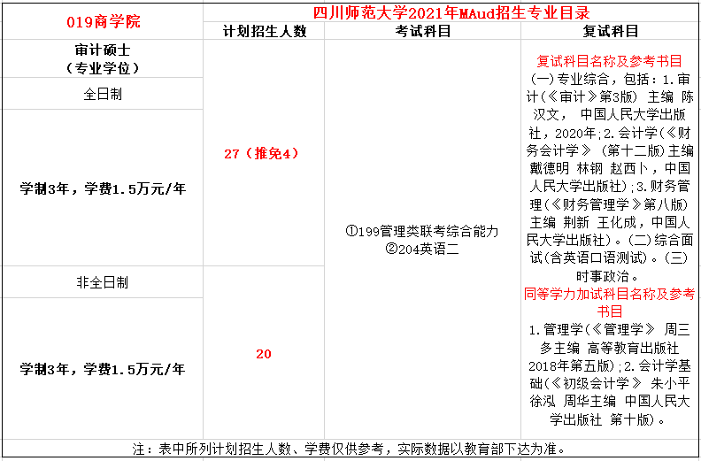 四川师范大学2021年MAud项目全日制计划招生27人,非全日制计划招生20人,学费每年15000元,学制3年。