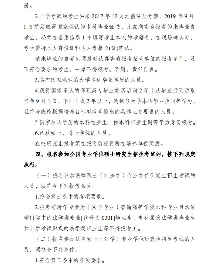 1、报名参加法律(非法学)专业学位硕士研究生招生考试的人员,须符合(一)中的各项要求,报考前所学专业为非法学专业(普通高等学校本科专业目录法学门类中的法学类专业[代码为0301]毕业生、专科层次法学类毕业生和自学考试形式的法学类毕业生等不得报考)。