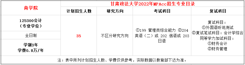 甘肃政法大学2021年MPAcc全日制招生50人,学费每年8000元,学制3年。