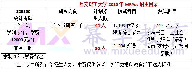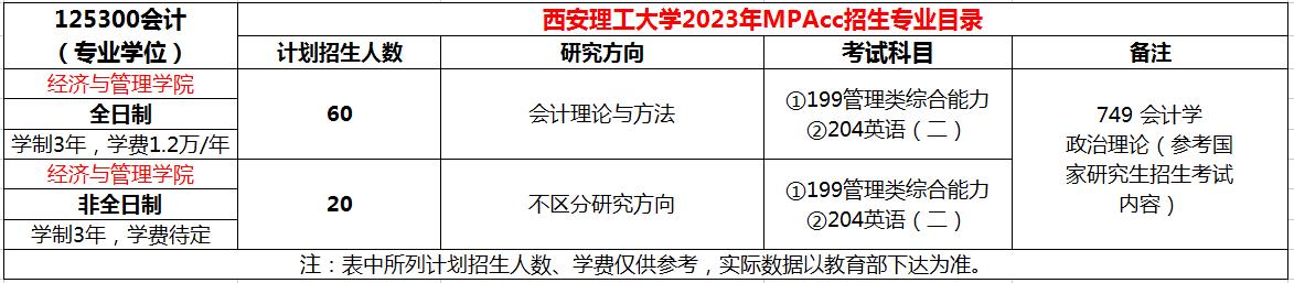 西安理工大学2023年招生简章已经公布!会计专硕计划招生全日制60人,学制3年,学费1.2万元/年;非全日制20人,学制3年,非全日制学费按照国家统一标准收取。