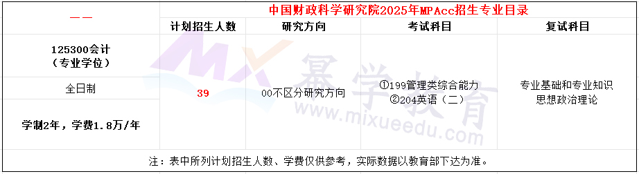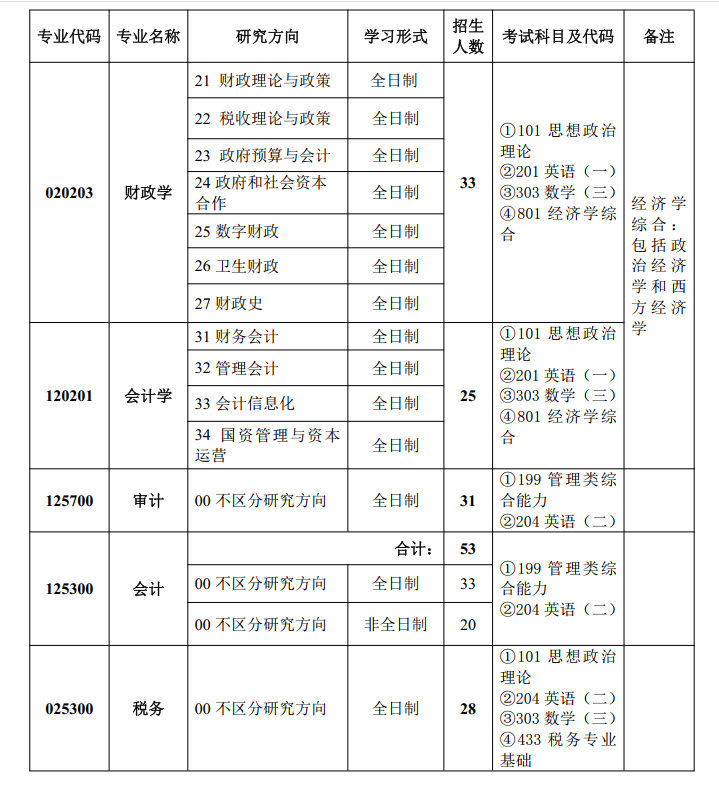 注:1.各专业(除非全日制会计专业)名额均含推荐免试生及少数民族骨干计划生,其中推免生计划招生名额分配:财政学6人、会计学5人(信息化方向2人)、审计6人、会计6人、税务5人,若有剩余推免招生名额,将调配至统考招生使用。少数民族骨干计划招生名额分配:财政学5人、会计学2人、审计5人、会计5人、税务3人。少数民族骨干计划招生事项详见财科院《2024年“少数民族高层次骨干人才计划”招收攻读硕士学位研究生(全日制)招生简章》。
