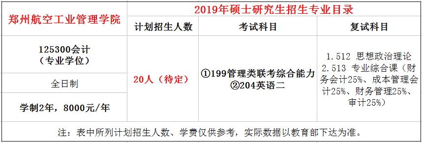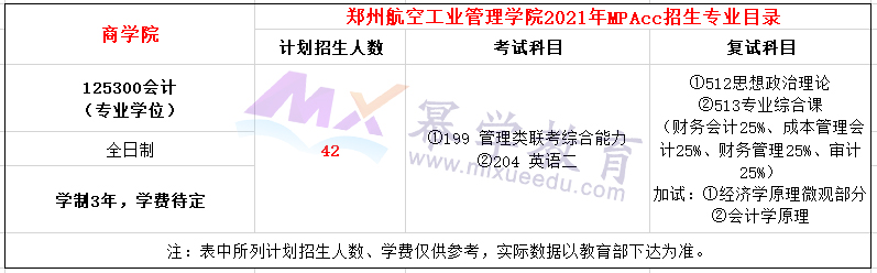 郑州航空工业管理学院2021年MPAcc全日制招生42人,学制2年。