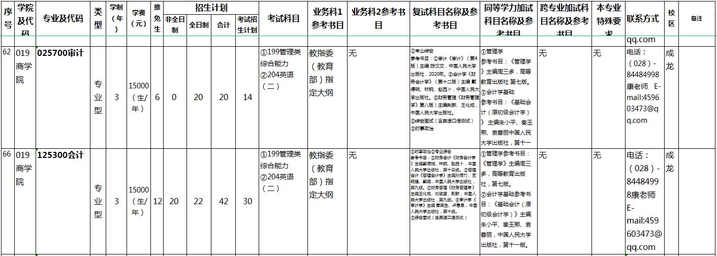 复试科目:(1)专业综合(参考书目:《会计学》(第九版)赵德武主编,西南财经大学出版社;《审计》(第4版)陈汉文主编 中国人民大学出版社2020年)。(2)综合面试(含英语口语测试)。