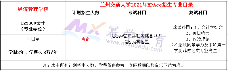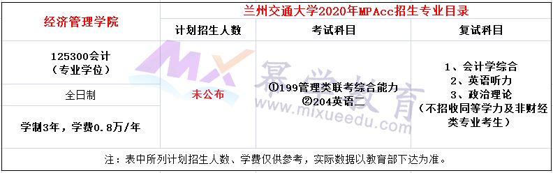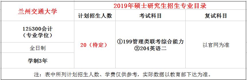 兰州交通大学2019年MPAcc全日制招收20人,学制3年。