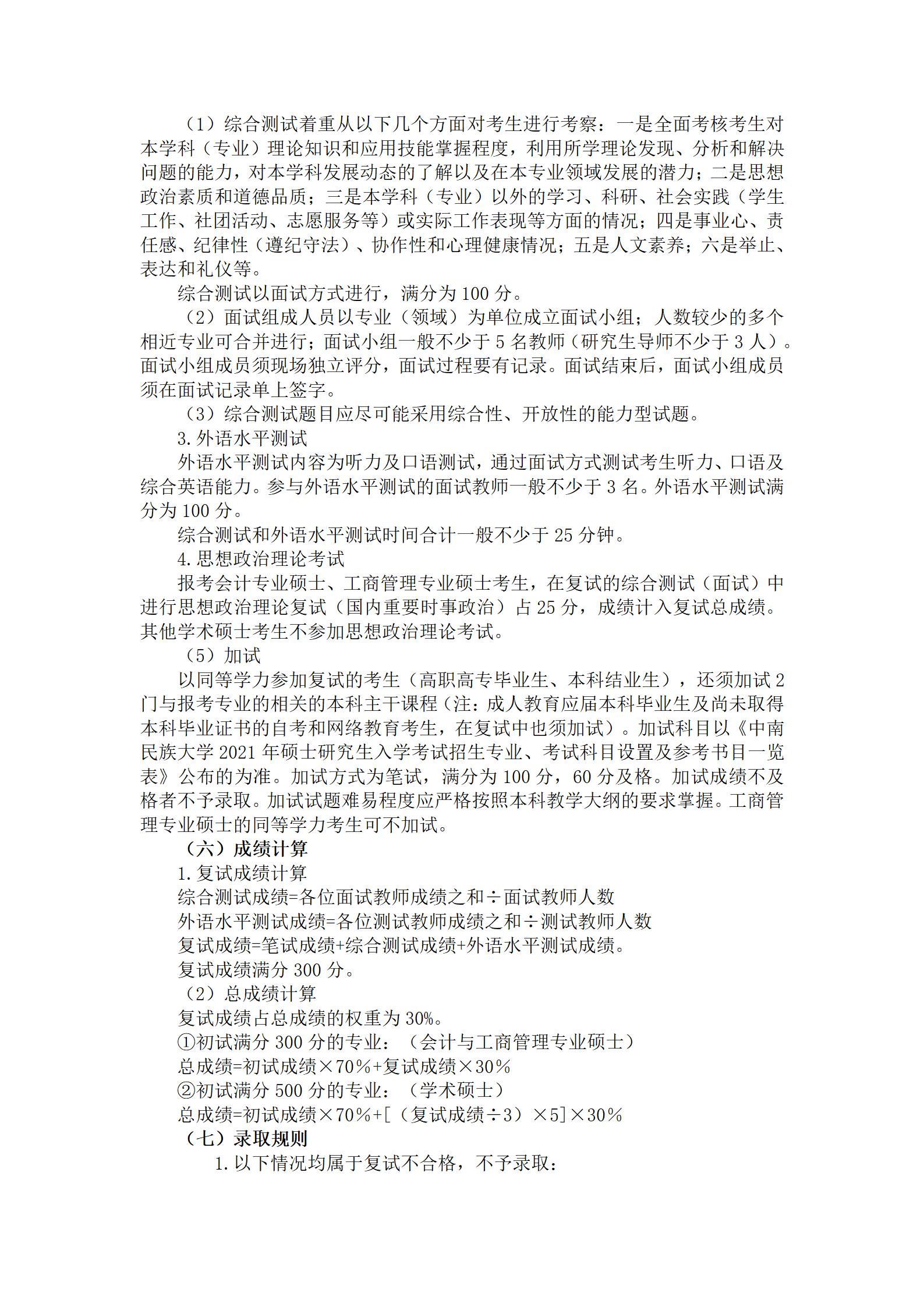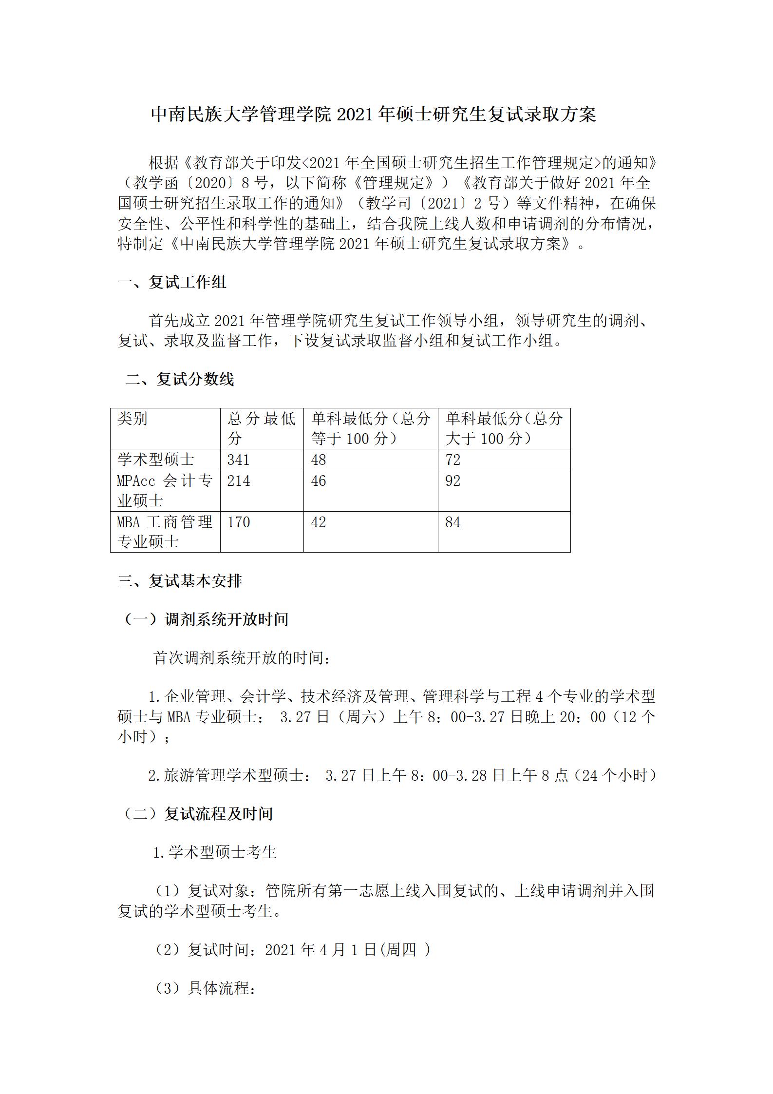根据《教育部关于印发<2019年全国硕士研究生招生工作管理规定>的通知》(教学〔2018〕5号)、《2019年全国硕士研究生招生工作管理规定》、《教育部关于加强硕士研究生招生复试工作的指导意见》(教学〔2006〕4号)、《教育部办公厅关于做好硕士研究生招生调剂工作的通知》(教学厅函〔2018〕14号)、《教育部办公厅关于统筹全日制和非全日制研究生管理工作的通知》(教研厅〔2016〕2号)、《全国会计硕士专业学位教育指导委员会关于加强双证MPACC复试工作的指导意见》等文件,以及教育部、湖北省招办2019年硕士研究生招生录取工作会议精神,结合我院上线人数和申请调剂的分布情况,特制定《中南民族大学管理学院2019年硕士研究生复试方案》。