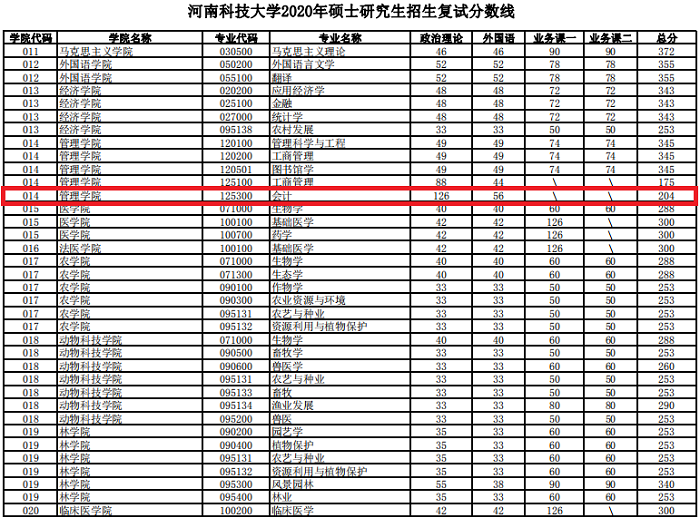 河南科技大学2020年MPAcc复试分数线的基本要求:204/56/126。