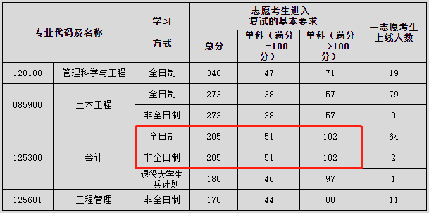 沈阳建筑大学2024年硕士研究生招生考试考生进入复试的初试成绩基本要求已公布,2024年MPAcc复试分数线:201/52/104。