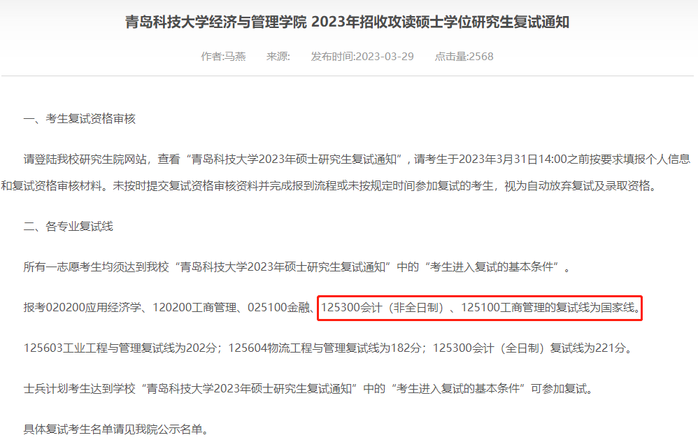 青岛科技大学2023年MPAcc复试分数线