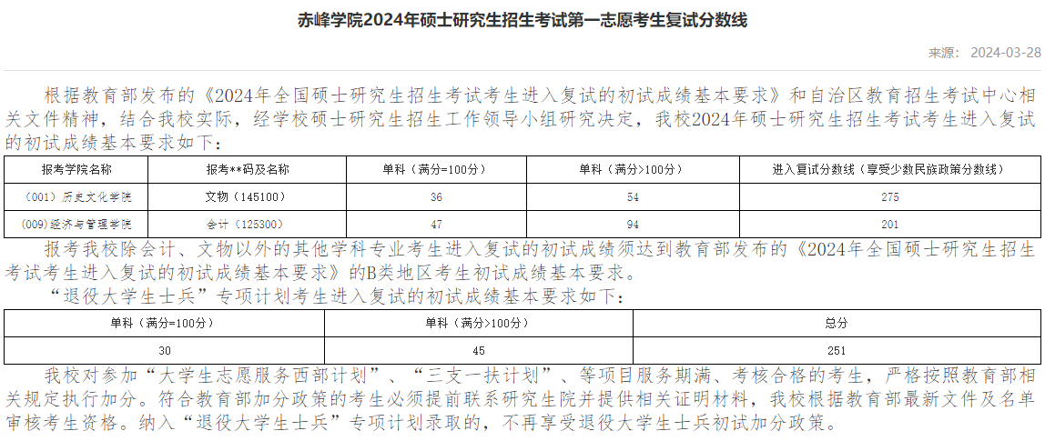 赤峰学院2024年硕士研究生招生考试考生进入复试的初试成绩基本要求已公布,2024年MPAcc复试分数线:201/47/94。