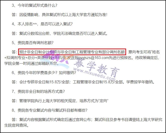 答:预计非全日制会计专硕与非全日制工程管理专业有部分调剂名额,意向考生可先点击链接进行预报名。待政策确定后,学院会第一时间通过邮箱联系您。