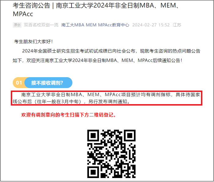 我院MBA/ MEM /MPAcc专业仅接收非全日制定向就业的调剂考生。