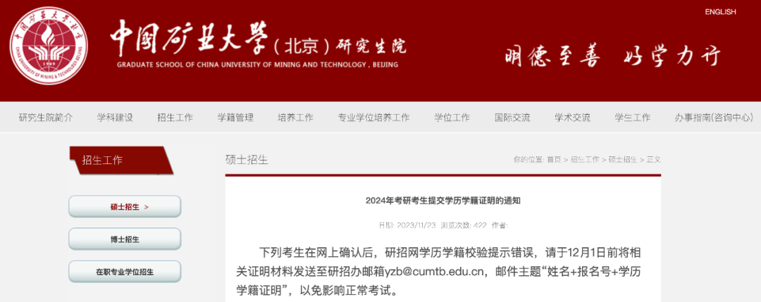 中国矿业大学(北京)通知考生补交材料,否则不予准考!