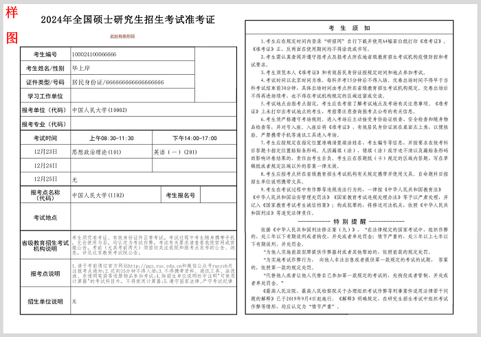 1、《准考证》由考生使用A4幅面白纸在规定时间内(2021年12月10日开始至12月27日)上网自行下载打印。《准考证》正、反两面在使用期间均不得涂改或书写。考生凭下载打印的《准考证》及居民身份证参加考研初试和复试 。