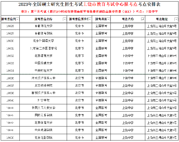 上饶市教育考试中心:从23年考场安排表我们就能看到一些规律,比如去年报考北京地区院校的,考点都是上饶中学,那么今年应该也大差不差。