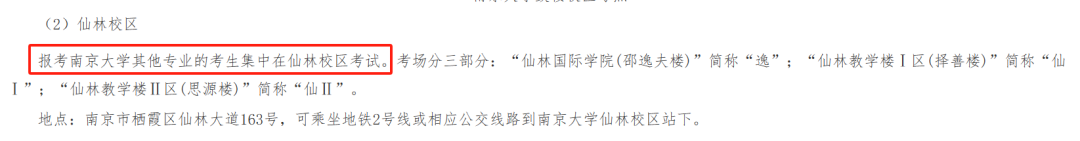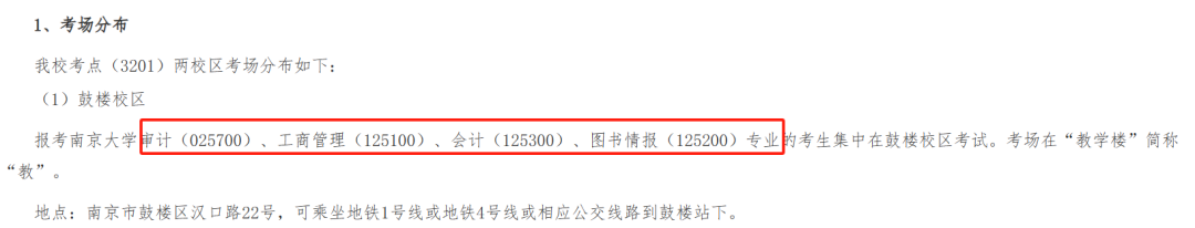 南京大学:报考南京大学审计(025700)、工商管理(125100)、会计(125300)、图书情报(125200)专业的考生集中在鼓楼校区考试;报考南京大学其他专业的考生集中在仙林校区考试。